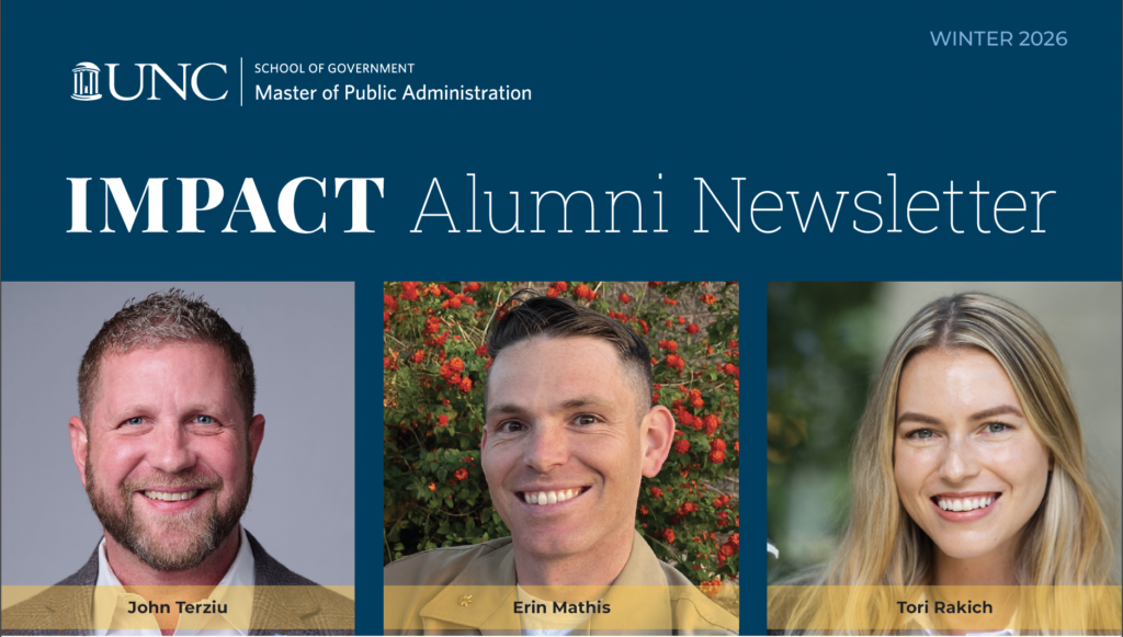 Stay informed through the UNC MPA bi-annual newsletter, IMPACT, which highlights program news and recognizes the accomplishments of our alumni, students, faculty, and staff. Read our most recent issues of IMPACT below.